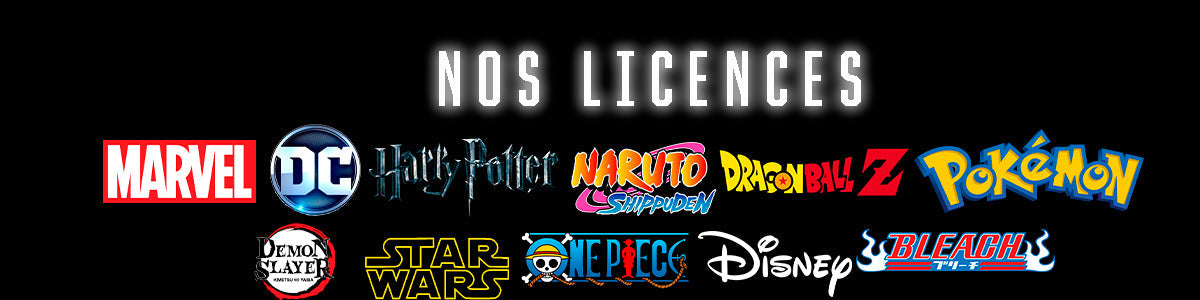 Retrouvez dans cette collection tous nos produits officiels sous licences, issus des univers les plus emblématiques de la pop culture. Que vous soyez fan de Harry Potter, Disney, Marvel, DC Comics, Pokémon, Dragon Ball, Bleach ou d’autres sagas cultes, vous trouverez ici une sélection exclusive de goodies, figurines, cartes, vêtements, jeux et objets collectors.
