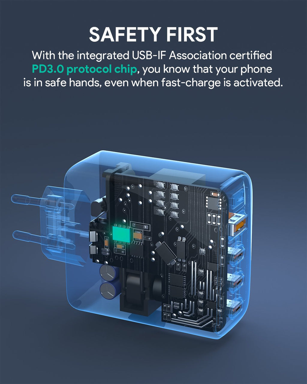 - Il peut délivrer 45W+30W+10W+10W lorsque quatre ports sont utilisés ensemble, ce qui permet de charger rapidement 4 appareils avec un seul chargeur