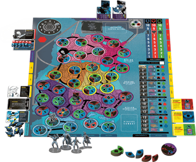 200+ cartes de jeu, 10 grandes cartes, 1 plateau de jeu, 160+ jetons, 21 figurines en carton, 21 socles, 1 marqueur effaçable, 11 dés Batarang gravés, 35 autres dés gravés, 5 livrets de règles, 17 figurines