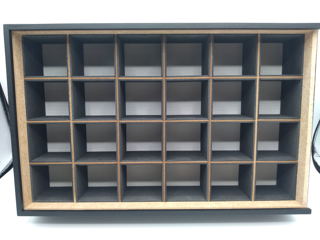 Pour ranger, présenter et transporter tes figurines, la COLLECTOR BOX est LA solution. Cette boîte de fabrication artisanale française est compartimentée en 24 cases grâce aux séparations fournies. Ces séparations sont revêtues de mousse EVA 2 mm pour amortir les chocs et permettre de sécuriser le transport de tes figurines. Capacité de stockage : de 24 à 48 figurines. Entièrement modulable tu pourras également adapter la boîte aux dimensions de tes pièces. (configuration en 6, 12 ou 24 cases) Possibilité de personnaliser la boîte avec des stickers. Accessoires vendus séparément : bouton aimanté pour fonction “Tiroir” et couvercle transparent pour fonction “Vitrine”.
