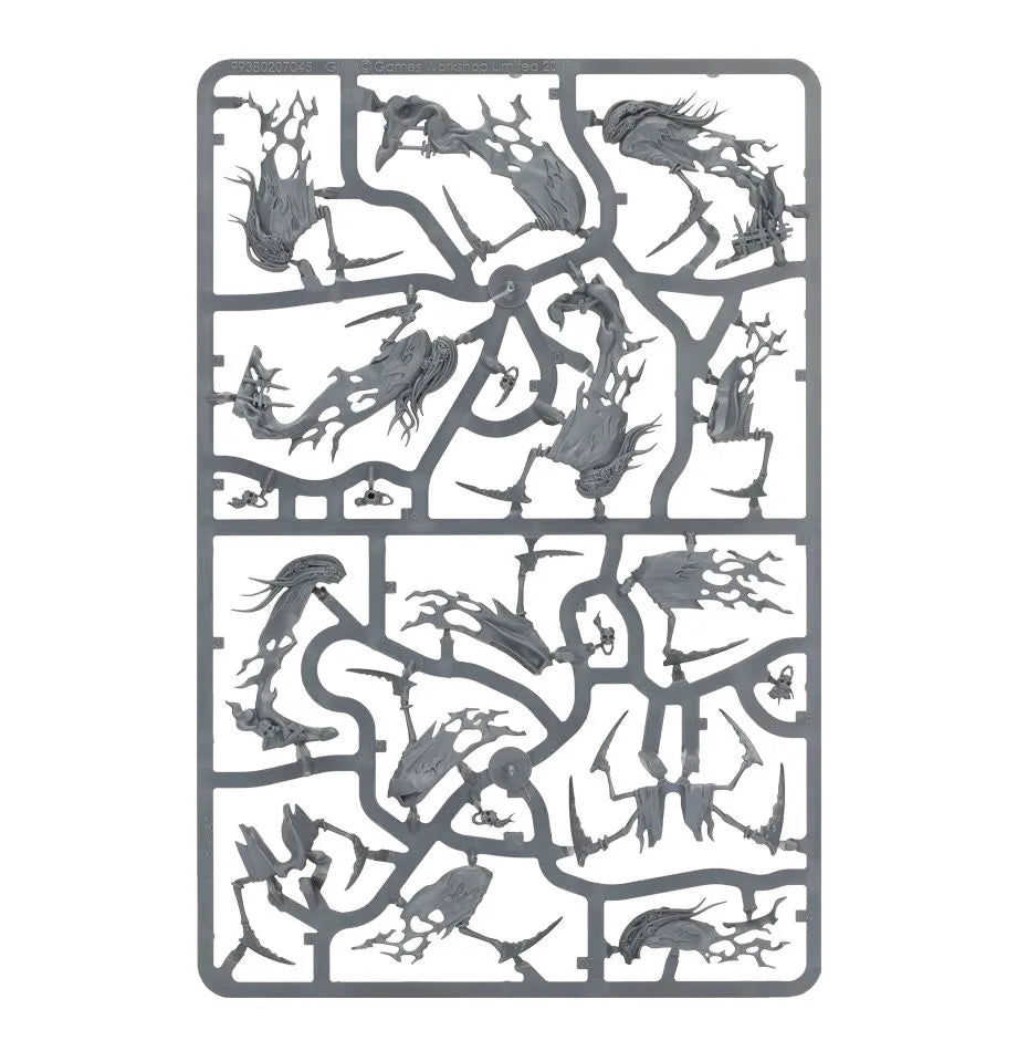 Ce kit plastique contient les composants nécessaires pour assembler 10 Dreadscythe Harridans. Particulièrement horribles et tragiques même pour des Nighthaunts, ce sont des revenantes éthérées en proie à un tourment hideux, dont les bras émaciés dépassent de leur linceul. Leurs membres faucheurs leur servent d'armes – à partir du poignet, ils ont la forme d'une lame de faux dentelée à angle droit pour mieux moissonner leurs victimes. Chacune a un crâne grimaçant en guise de tête, et une longue chevelure ironiquement tressée de roses. 4 de ces figurines comportent une variante de bras droit, pour donner un peu de variété à l'assemblage, et vous avez l'option de monter 2 Slasher Crones. Ce sont les chefs d'unité des Dreadscythe Harridans, qui se distinguent par leurs 4 bras au lieu de 2. Toutes se relient à leur socle par des débris de cimetière tels que rocs et morceaux de fer forgé.