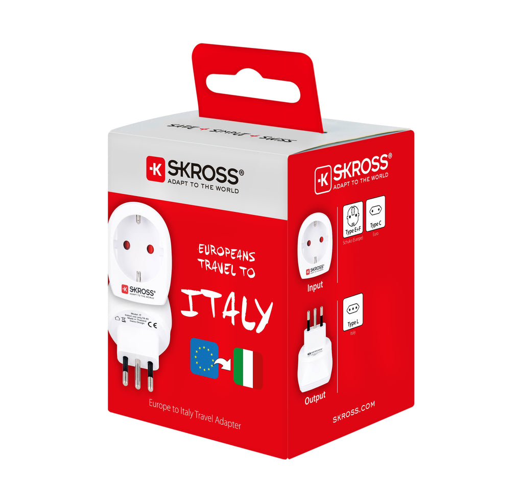 La prise standard italienne est utilisée dans 9 pays du monde. Notre adaptateur SKROSS® Europe vers Italie fournit une connexion fiable et facile pour les appareils équipés d'une fiche Schuko ou Euro.