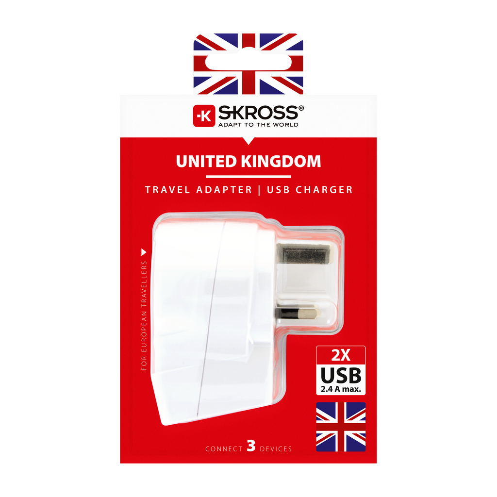 La norme de la prise britannique est utilisée dans plus de 50 destinations dans le monde. Cet adaptateur de voyage SKROSS® offre une connexion fiable et facile pour les appareils équipés d'une fiche Schuko ou Euro. Il prend en charge en toute sécurité même les appareils gourmands en énergie tels que les ordinateurs portables et les sèche-cheveux, tout en permettant de recharger efficacement deux appareils USB en même temps.