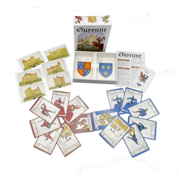 Guyenne est un jeu de bluff et de conquête de châteaux, inspiré d’une période clé de l’Histoire de France. Conçu pour 2 joueurs, il met en valeur le patrimoine médiéval à travers des mécaniques stratégiques et immersives.