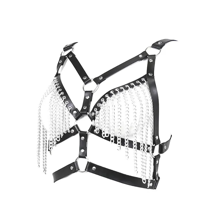 En similicuir noir avec chaînettes argentées, ce bustier bijou sublimera vos courbes et fera chavirer de désir votre partenaire.