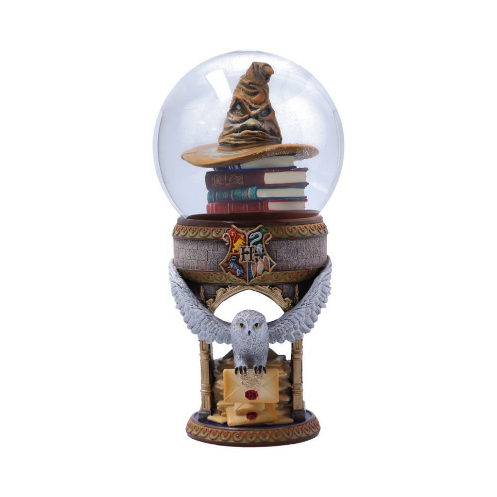 Hedwige, la chouette des neiges de Harry Potter, s'accroche à une lettre d'acceptation de Poudlard. À l'intérieur du Globe, au sommet d'une pile de livres de sorts, se trouve le célèbre Choixpeau qui répartit tous les nouveaux élèves dans leurs maisons.