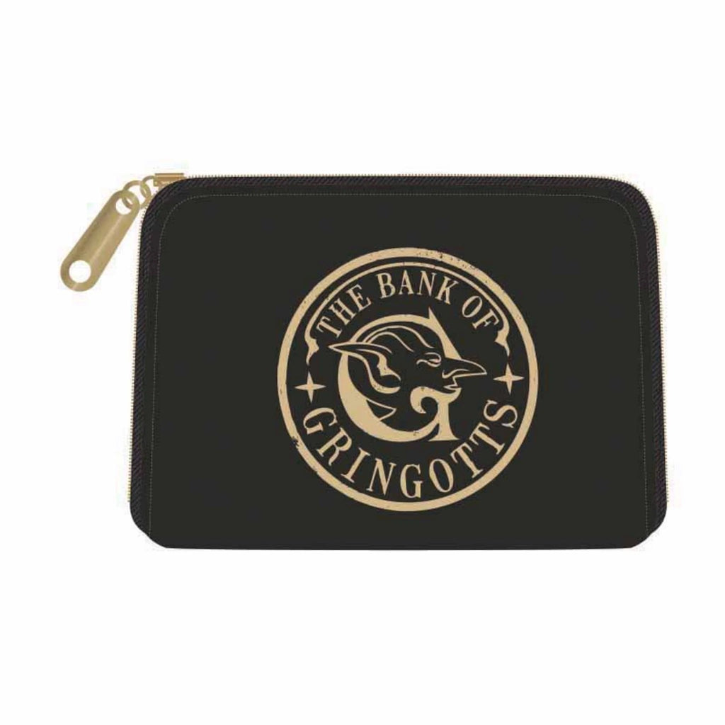 Ce porte-monnaie Harry Potter est l'endroit idéal pour ranger toute votre petite monnaie. La face avant présente le logo de la banque Gringotts en crème sur fond noir. Le porte-monnaie a une bordure noire, une fermeture éclair dorée et une doublure intérieure marron. L'intérieur comporte deux compartiments principaux et deux emplacements pour cartes.