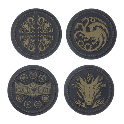 Les quatre sous-verres en métal sont ornés de sigils et de symboles de la Maison Targaryen et de la Maison Velaryon. Chaque sous-verre est doté d'un support en liège pour une meilleure adhérence.