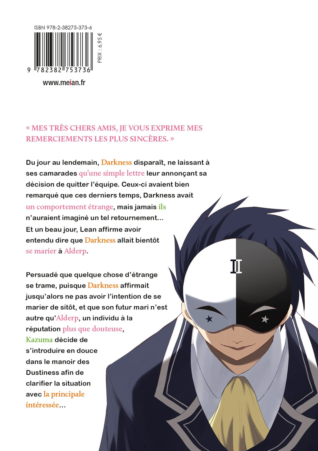 Persuadé que quelque chose d'étrange se trame, puisque Darkness affirmait jusqu'alors ne pas avoir l'intention de se marier de sitôt, et que son futur mari n'est autre qu'Alderp, un individu à la réputation plus que douteuse, Kazuma décide de s'introduire en douce dans le manoir des Dustiness afin de clarifier la situation avec la principale intéressée...