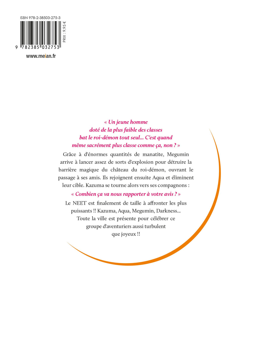 Sur ces mots se termine la lettre laissée par Aqua lors de sa fugue, une fois l'agitation semée par Selena passée. En découvrant la disparition de sa mascotte, la ville est parcourue d'une agitation soudaine ! Malgré la situation, Kazuma utilise le prétexte de son faible niveau pour ne pas partir à sa recherche ?! Face à son comportement pour le moins étrange, Megumin propose d'aller affronter des crapauds géants ! Ce faisant, Kazuma découvre une méthode inimaginable pour gagner en puissance à toute vitesse !!