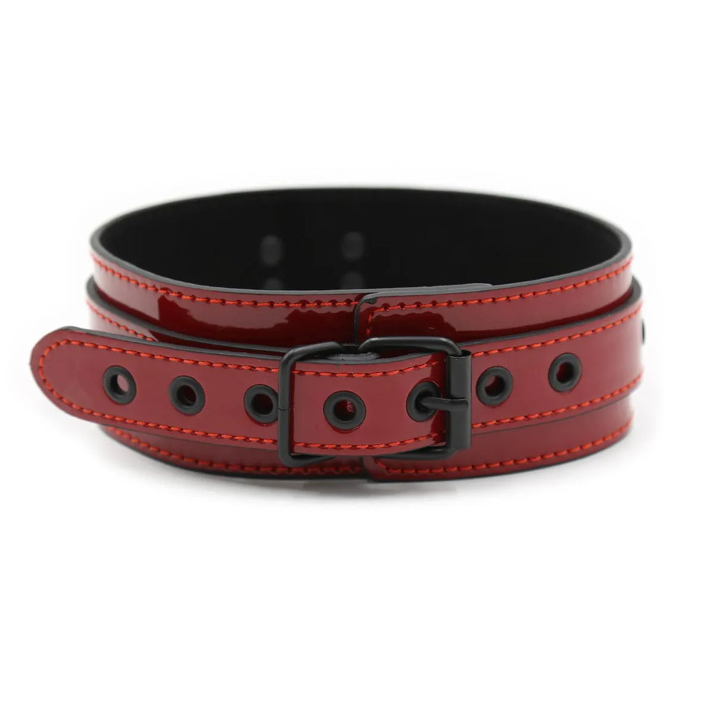 Aussi élégant que confortable, ce collier en similicuir vernis rouge est réglable, et dispose d'un anneau auquel vous pourrez accrocher une laisse, une corde ou encore une chaîne selon vos désirs.
