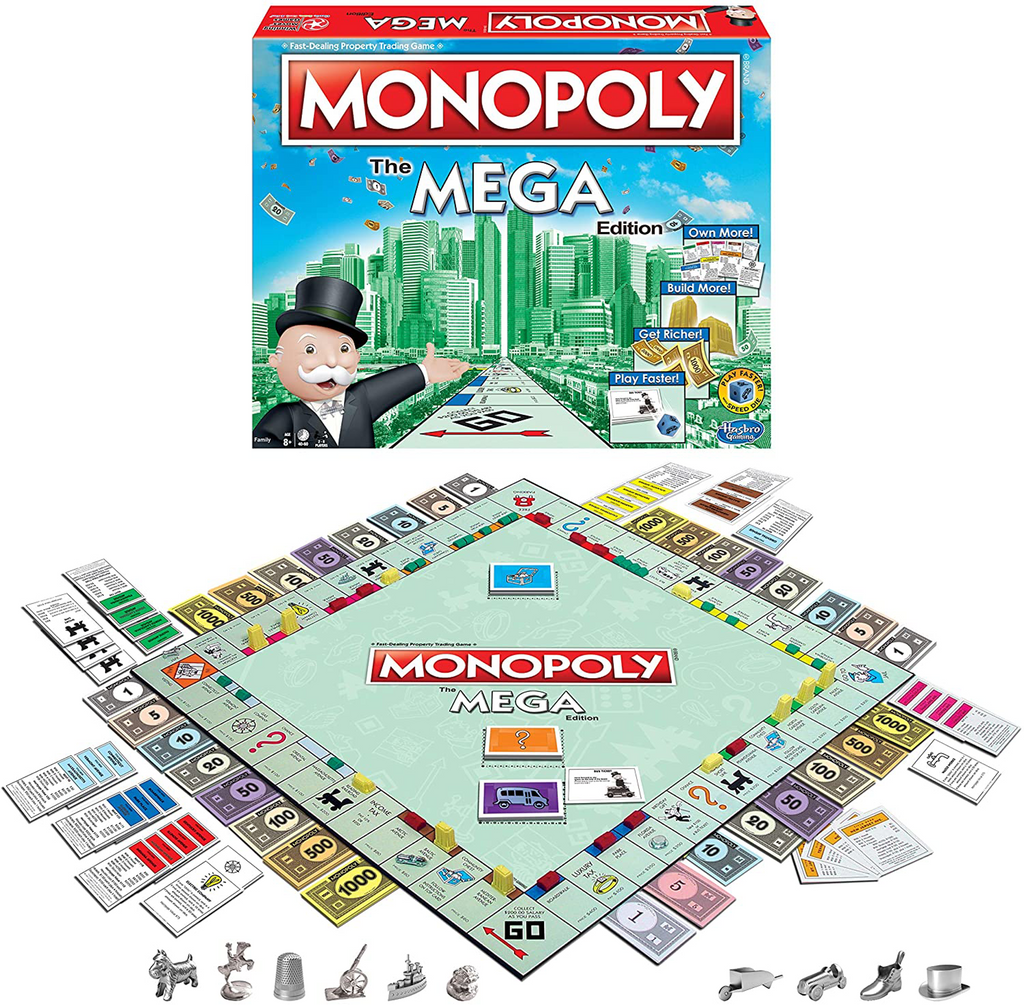 Monopoly EDITION MEGA : jeu de société où le but est d'être le dernier joueur à ne pas faire faillite. Version française.