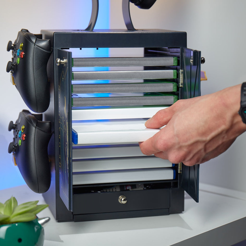 Complétez votre installation de gaming ultime avec cet impressionnant meuble de rangement pour jeux. Capable de contenir jusqu'à 10 de vos jeux ou films préférés, ce casier comporte des compartiments pour ranger tous vos éléments essentiels tels que manettes, câbles et autres. Sans oublier qu'il permet de placer votre casque en toute sécurité sur le dessus. C'est l'accessoire de gaming idéal pour ranger tous vos jeux et accessoires.