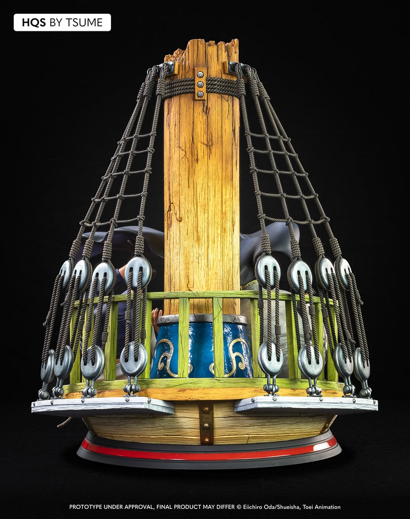 Cette statue HQS 1/7 de Shanks met en évidence son incroyable puissance et son indéniable prestance. Après avoir réceptionné une certaine lettre, Barbe Blanche exige que son auteur vienne lui délivrer son message de vive voix, sous condition d’apporter de la bonne « gnole » ! On voit ici Shanks monter à bord du Moby Dick, avançant dans la direction de son célèbre capitaine. Il traîne sur le pont une énorme jarre ronde de Saké comme l’indique le kanji peint en noir sur celle-ci, « le meilleur » selon lui, puisqu’il a été fait chez lui, à West Blue.