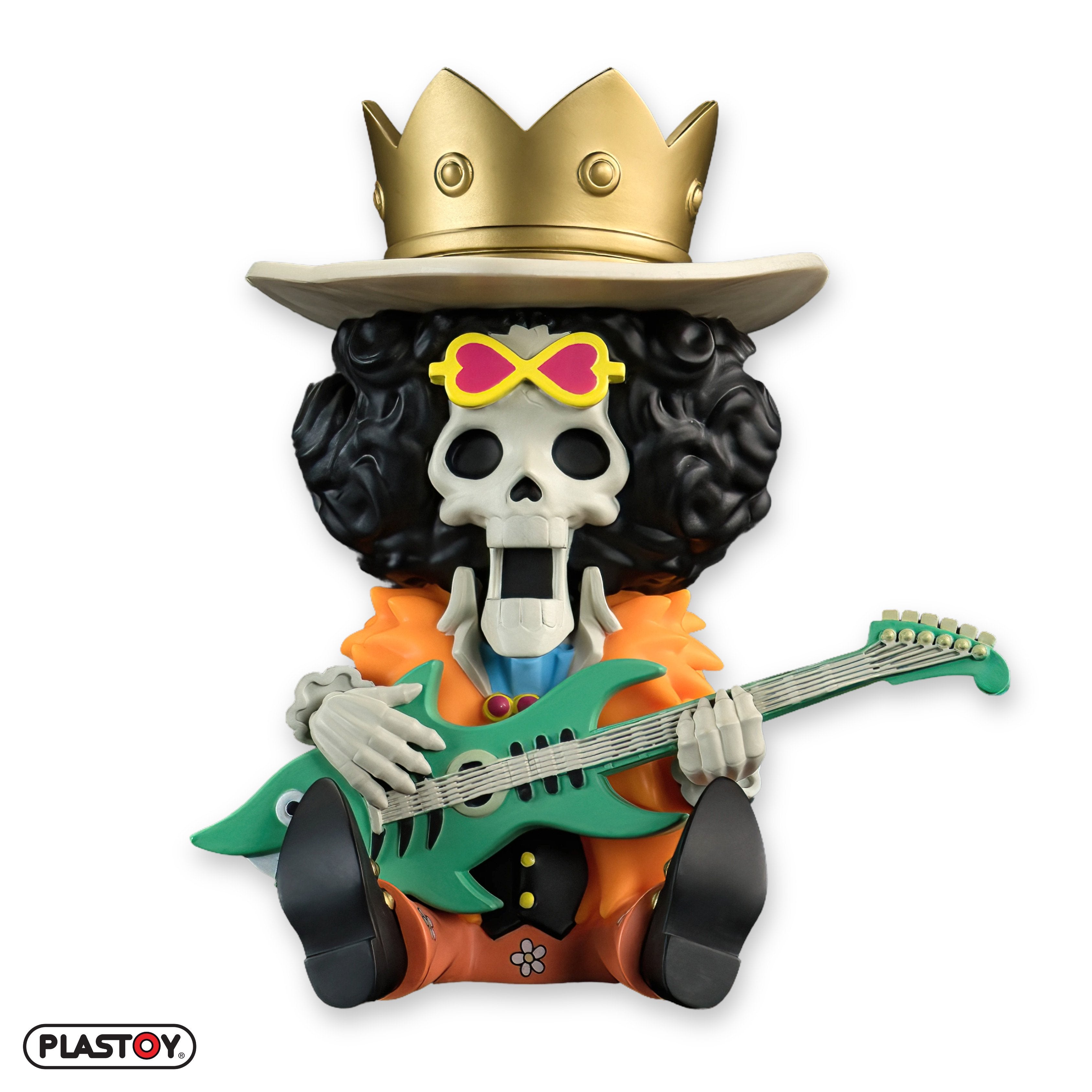 Économisez vos trésors avec style grâce à cette figurine tirelire à l'effigie de Brook, le musicien squelettique de l'Équipage du Chapeau de Paille dans le manga One Piece !