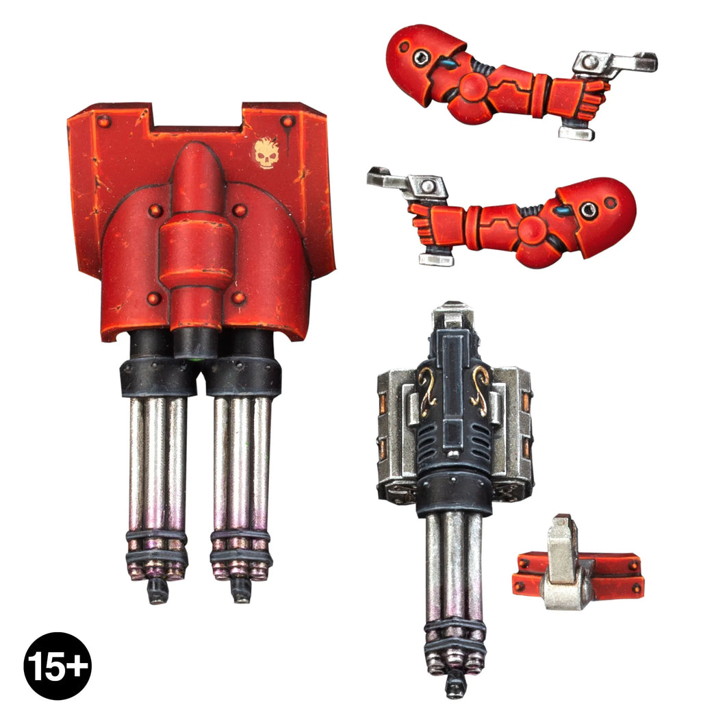 Ce kit d'amélioration en résine vous permet d'améliorer vos véhicules de la Légion des Blood Angels grâce à des canons d'assaut modèle Iliastus, décorés d'élégantes arabesques. Les Fils de Sanguinius installent ces armes sur pivot pour découper l'infanterie qui s'approche de leurs chars, ou combinent deux canons d'assaut sur la tourelle d'un Predator pour créer le char Predator Baal unique.