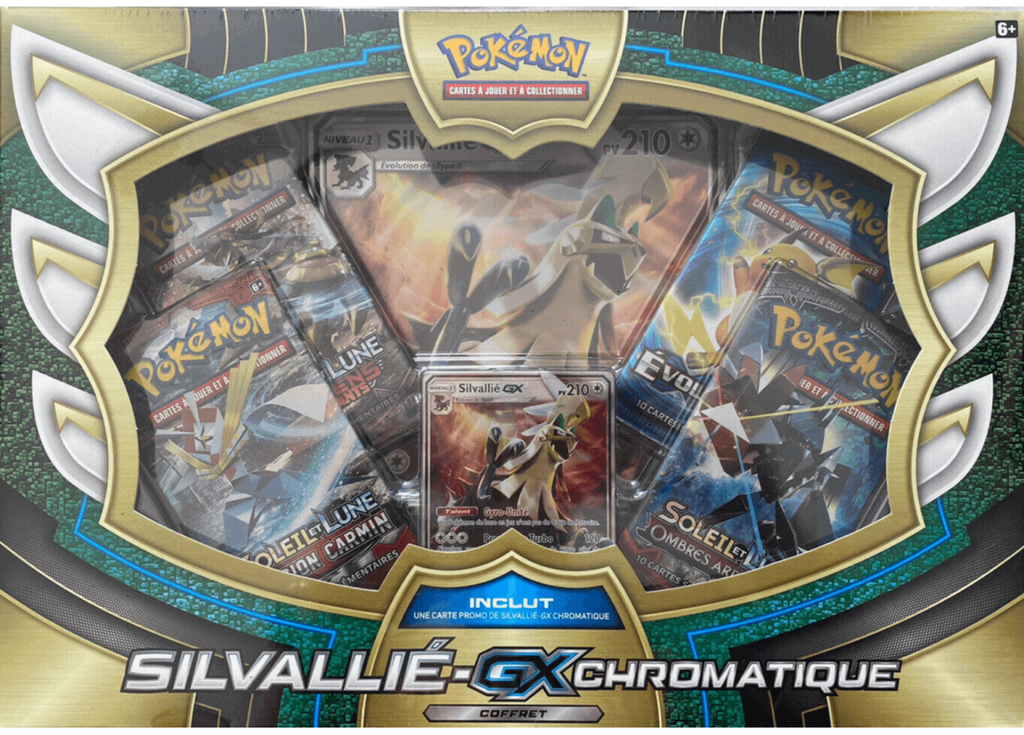 Le Pokémon JCC - Silvallié-GX Chromatique Coffret est un ensemble de collectionneur exclusif qui comprend 2 cartes Pokémon d'édition spéciale, 1 carte Pokémon à l'état holo, une capacité GX Chromatique et 4 paquets de cartes JCC. Cet ensemble collector répondra aux attentes des collectionneurs et des joueurs les plus exigeants et fera de votre collection une pièce unique.