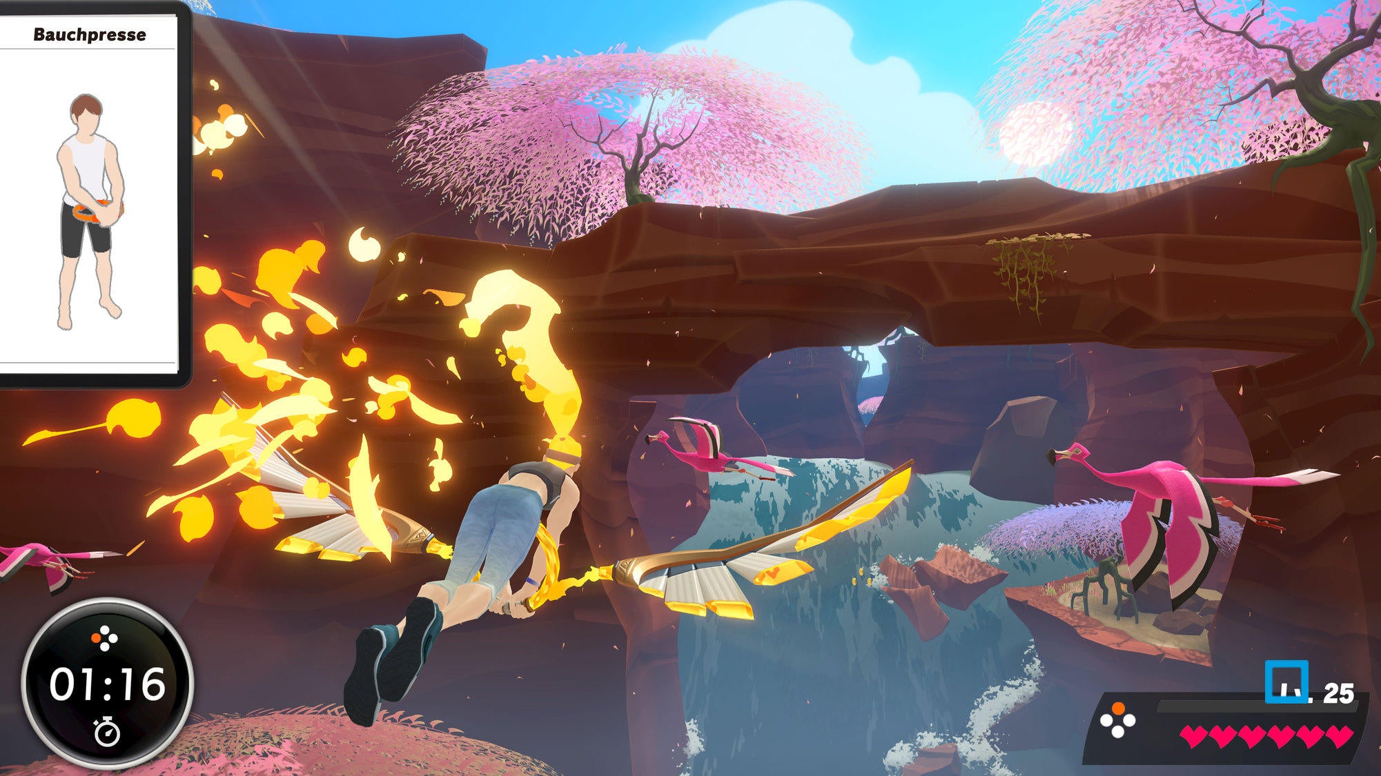 En mode aventure, vous vous déplacez dans le jeu en faisant du jogging sur place pour parcourir un monde fantastique. Il y a plus de 20 mondes à découvrir. Vous devrez également faire différents exercices de force et de yoga pour combattre vos ennemis. Il existe plus de 40 exercices répartis dans les catégories bras, abdomen, jambes et yoga. Le jeu fournit des instructions sur la manière d'effectuer correctement les exercices.