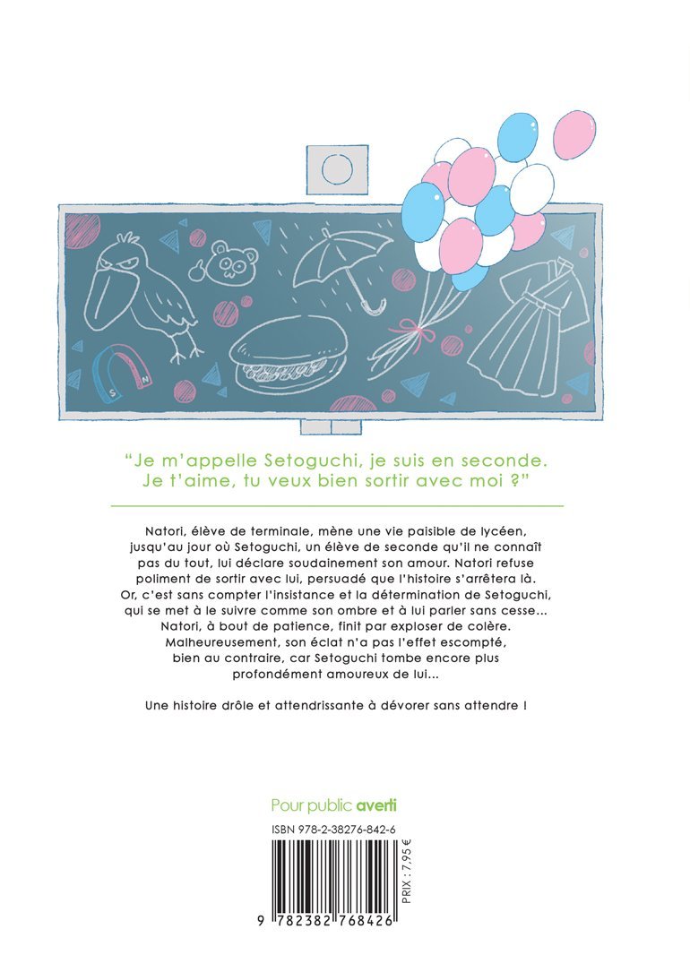 Natori, élève de terminale, mène une vie paisible de lycéen, jusqu'au jour où Setoguchi, un élève de seconde qu'il ne connaît pas du tout, lui déclare soudainement son amour. Natori refuse poliment de sortir avec lui, persuadé que l'histoire s'arrêtera là. Or, c'est sans compter l'insistance et la détermination de Setoguchi, qui se met à le suivre comme son ombre et à lui parler sans cesse...