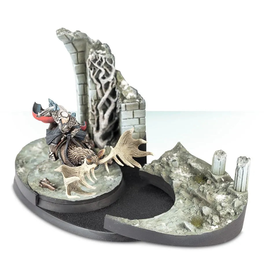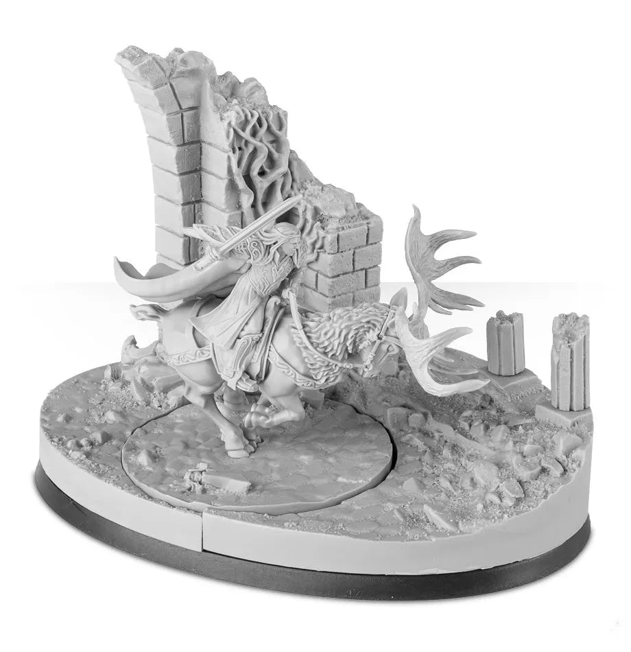 A swordsman of consummate skill, Thranduil is one of the mightiest heroes available, capable of hacking down countless enemies with his Elven blades. This resin model, which comes in a presentation box as part of The Hobbit: Motion Picture Trilogy™ Character Series, is a fantastically detailed rendition of Thranduil, King of the Woodland Realm charging into battle atop a powerful war Elk, blade held aloft. Not only does this model feature intricate details – the armour, hair and cloak of Thranduil as well as the mane of the Elk are picked out elegantly – but it features a lavishly-sculpted scenic base, depicting a broken archway and pillars with a slain enemy lying prone. The scenic base comes apart, and Thranduil can be lifted out on his own gaming base.