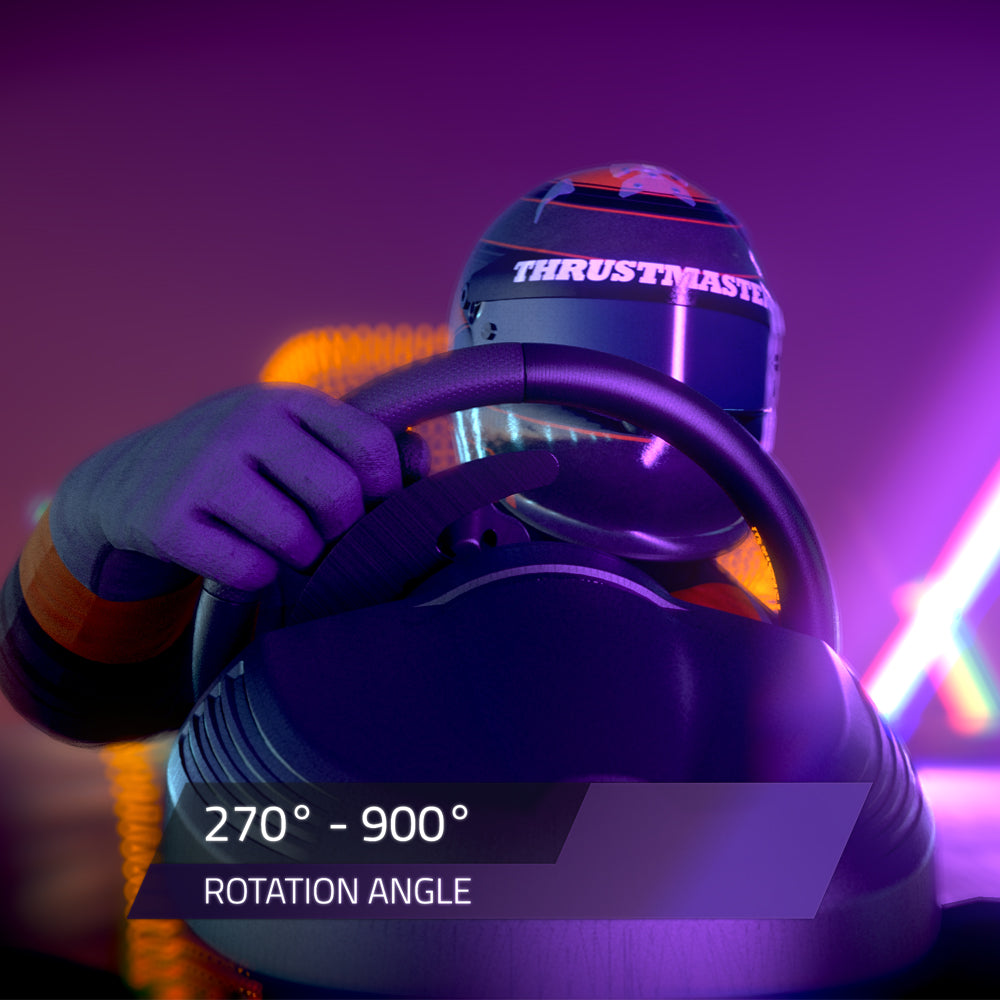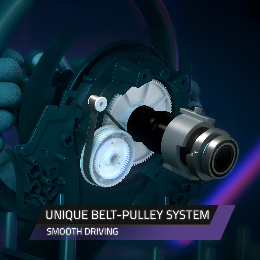 - Entraînement avec retour de force ajustable pour ressentir tous les détails en course (relief de la route, perte d’adhérence, freinage, chocs, etc.)