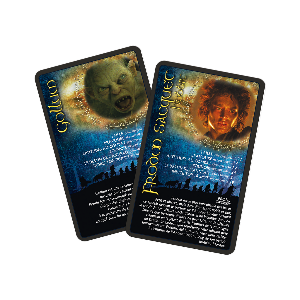 Dans Top Trumps, l’objectif du jeu est de récupérer toutes les cartes de ses adversaires en choisissant sa meilleure caractéristique sur le thème du Seigneur des Anneaux.