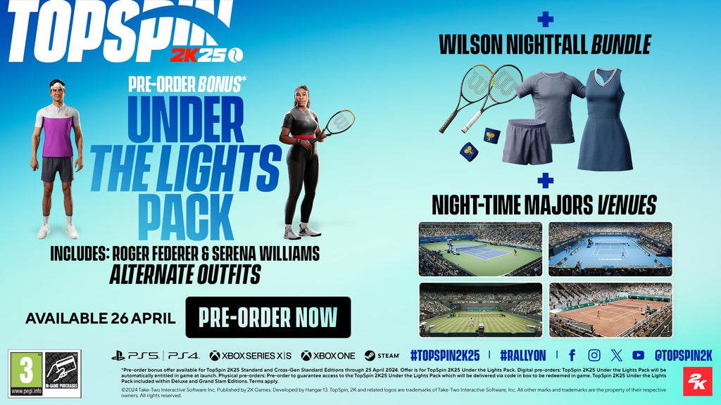 La franchise TopSpin est de retour avec TopSpin 2K25, où figurent les légendes du tennis Roger Federer et Serena Williams, ainsi qu'un ensemble d'autres pros jouables, des modes solo et multijoueur en ligne, chacun des quatre tournois historiques du Grand Chelem®, et bien plus encore !
