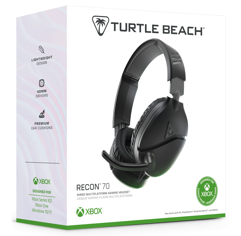 Le casque gaming multiplateforme Turtle Beach® Recon 70 est conçu pour votre prochaine victoire, votre prochain exploit et bien plus. Il comprend le dernier design de casque Turtle Beach, léger et confortable, pour des heures de jeu. Ses écouteurs 40 mm de haute qualité et ses coussinets enveloppants en cuir synthétique premium vous laissent entendre des aigus nets et des basses tonitruantes tout en bloquant les bruits. En plus de cela, pour un son encore plus immersif, le Recon 70 est compatible avec les technologies de son spatial comme Windows Sonic, Dolby Atmos, DTS Headphone: X* et Sony 3D Audio pour PS5™. Le célèbre microphone ultrasensible de Turtle Beach capte votre voix de façon claire et se coupe en un seul geste. Enfin, la connexion polyvalente 3,5 mm facilite son utilisation avec les manettes Xbox, PlayStation®, Nintendo Switch™, ainsi qu'avec les PC et appareils mobiles disposant d'une prise 3,5 mm. (150)
