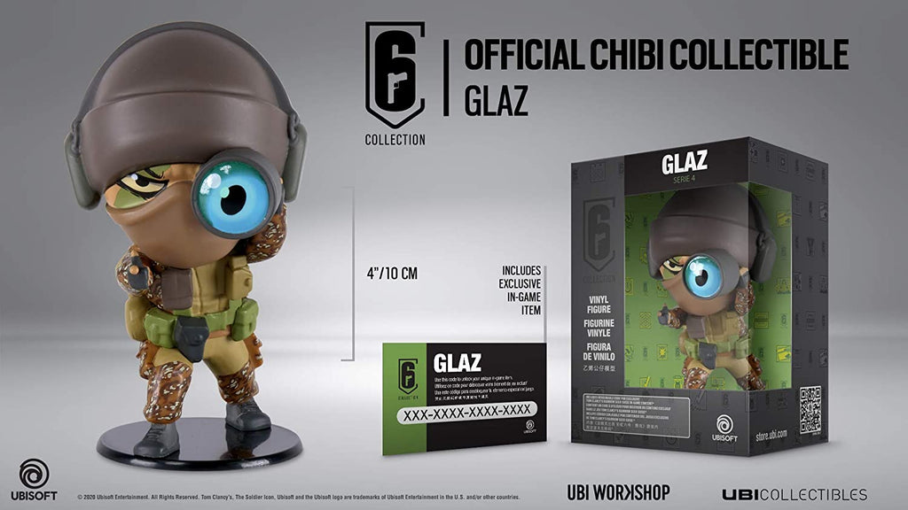 L'heure est venue de recruter de nouveaux agents dans votre équipe ! Accueillons Glaz et son viseur HDS unique. Glaz fait partie de la quatrième série de chibis Six Collection, aux côtés de Finka, Dokkaebi et Blitz. Chaque figurine comprend un code unique permettant de débloquer du contenu exclusif dans Rainbow Six Siege®.