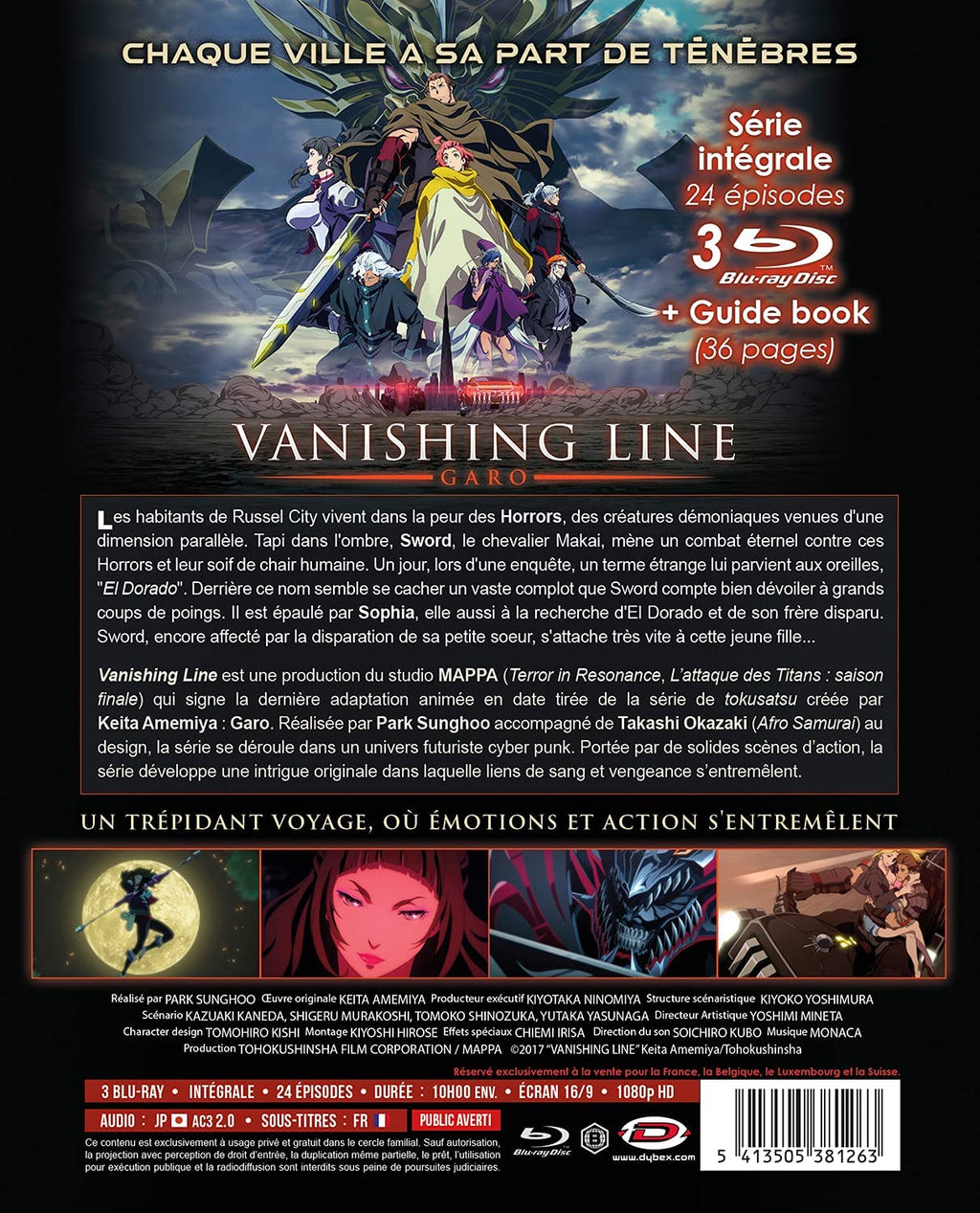 Vanishing Line est une production du studio MAPPA (Jujutsu Kaisen, Rage of Bahamut) qui signe la dernière adaptation animée en date tirée de la série de tokusatsu créée par Keita Amamiya : Garo. Réalisée par Seong Ho Park accompagné de Kiyoko Yoshimura (Last Exile Fam) au script et Takashi Okazaki (Afro Samurai) au design, la série se déroule dans un univers futuriste cyber punk. Portée par de solides scènes d'action, la série développe une intrigue originale dans laquelle liens de sang et vengeance s'entremêlent.