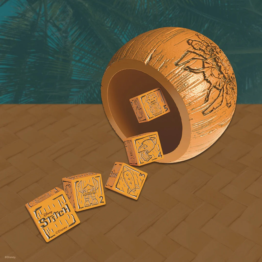 Rejoignez l'expérience 626 dans YAHTZEE® : Disney Stitch et jouez pour obtenir le meilleur score avec des dés personnalisés représentant des personnages et des objets du film, tels que Lilo, le blaster à plasma de Stitch et une fusée. « Secouez, lancez et criez" en utilisant un gobelet à dés de style tiki à collectionner qui montre Stitch dans une série de poses amusantes alors que vous célébrez des victoires hors du commun.